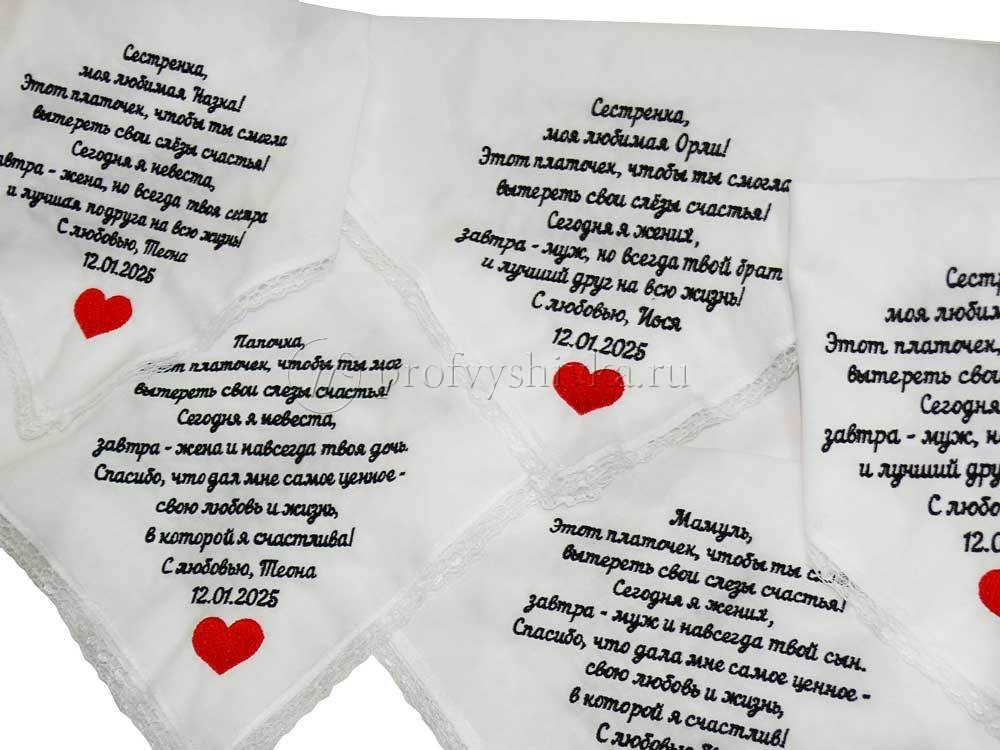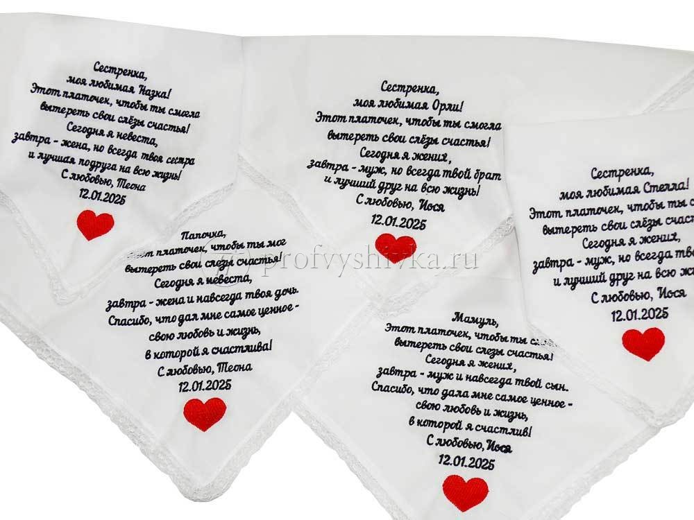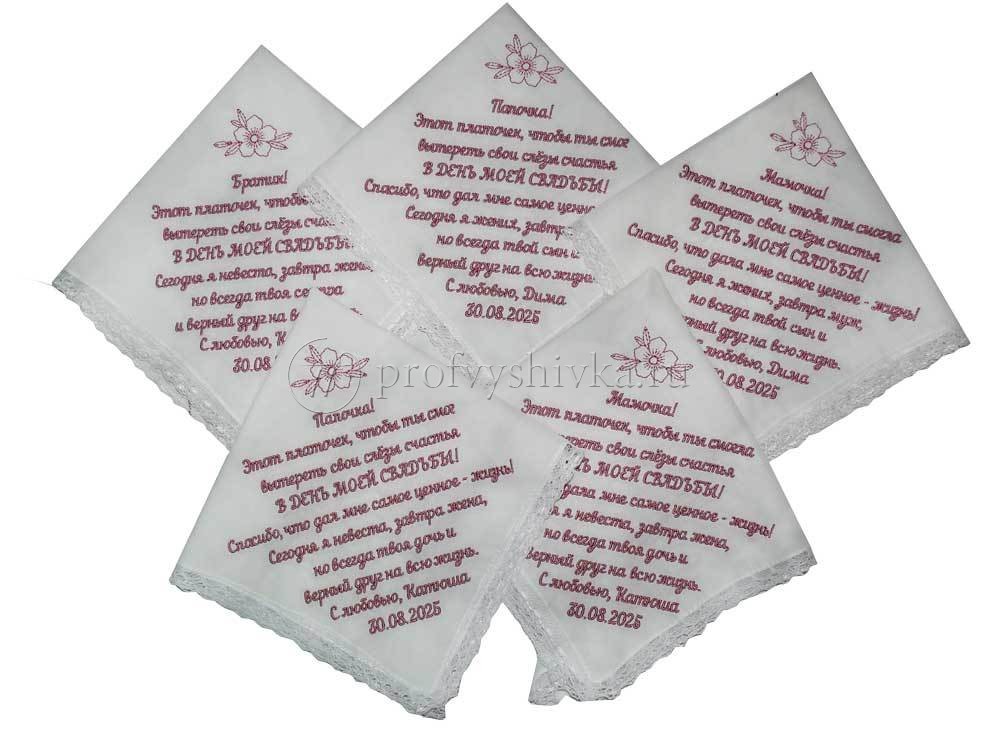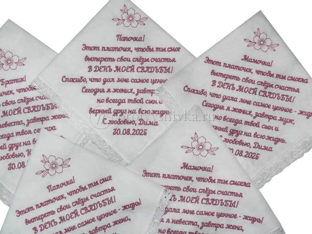 Создайте трогательные и незабываемые сувениры для своих близких с помощью нашей вышивки на свадебных платочках. Мы предлагаем вышивку имен, дат, инициалов и особых посланий на платочках для мамы, папы, бабушки и дедушки. Эти платочки станут символом любви и благодарности, которые останутся в памяти на долгие годы.