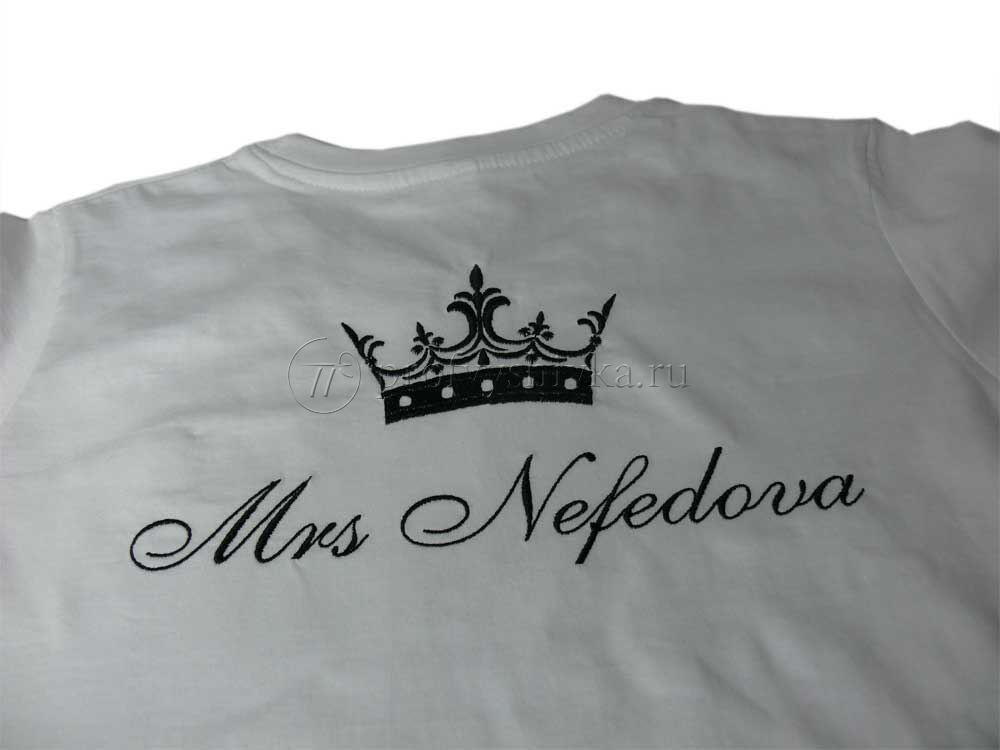 На футболке можно вышить, что угодно. Это зависит от вашей фантазии и пожелания. Любой текст, любым шрифтом, любой размер и цвет – на ваш выбор. Фамилию можно украсить декоративным элементом, вензелями, короной.
