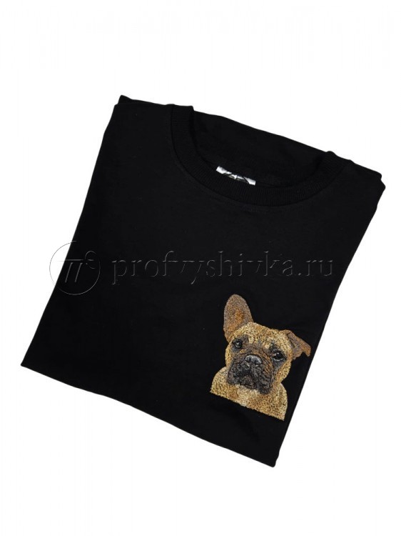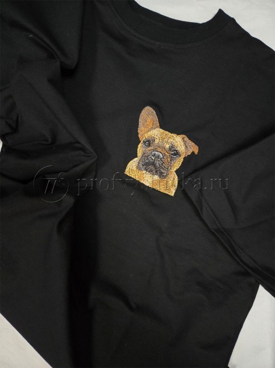 С радостью сообщаем, что мы завершили новый интересный проект: уникальная черная футболка с вышивкой французского бульдога! Этот заказ стал отличным примером того, как можно сочетать стиль и любовь к домашним питомцам.