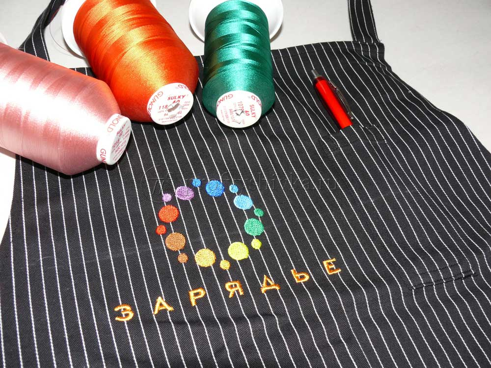 Мы вышиваем как на своих изделиях, так и на одеже, которую нам приносят. Принимаем в работу любой тираж. Работаем и с единичными заказами. Вышивка "Зарядье" стильно сморится на черном фартуке с принотом.