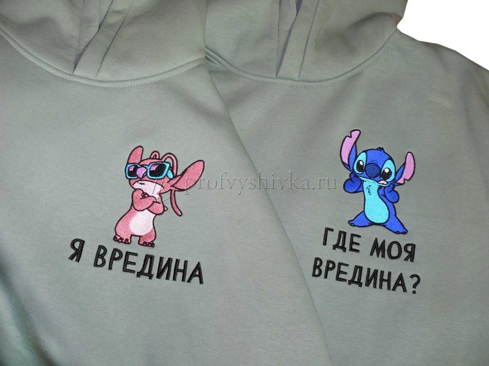 Парную вышивку можно нанести на любую одежду, но чаще всего на толстовки, худи, лонгсливы, футболки. Одежда может быть ваша, или мы можем закупить для вам необходимый текстиль.