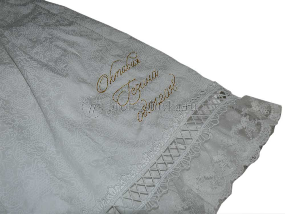 Украсить одежду можно церковной символикой, крестами, ангелами, цветами, узорами, вензелями. Часто просят разместить на детской одежде имя ребёнка и дату крещения, монограмму.