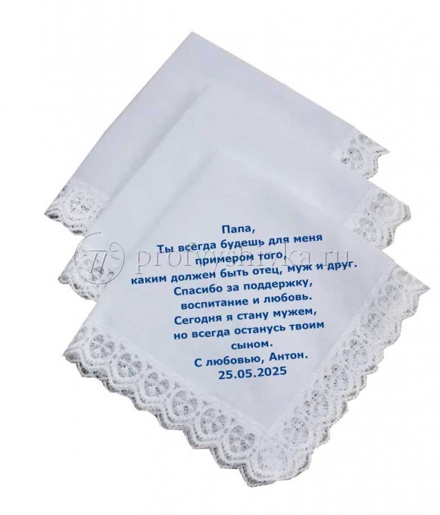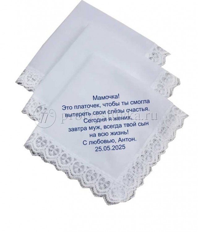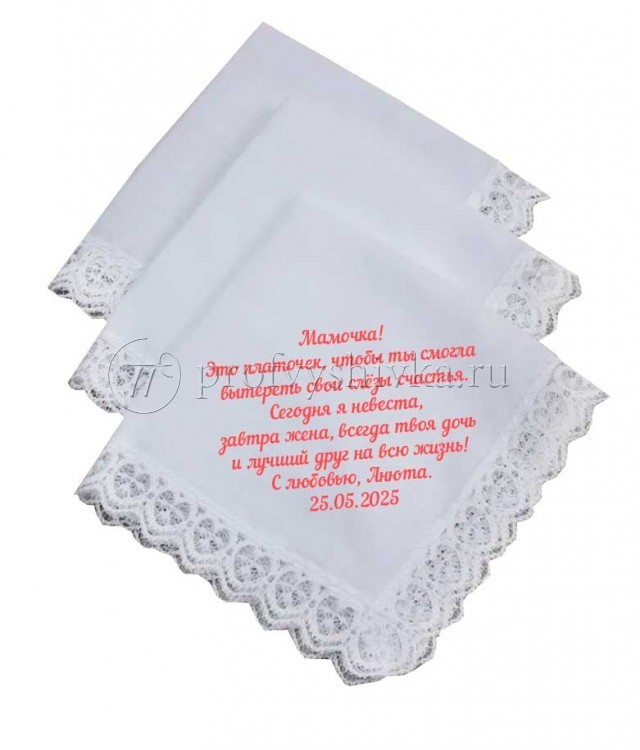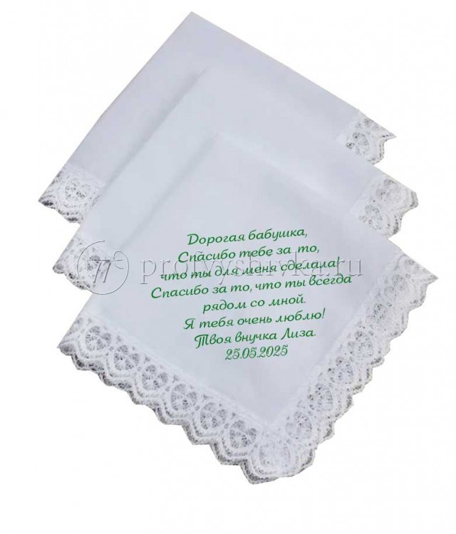 Минимальный тираж начинается от одной штуки, что позволяет вам заказать даже небольшое количество платочков для самых близких людей. Наши мастера оперативно выполняют заказы, учитывая все ваши пожелания и требования. Вы получите готовые изделия в кратчайшие сроки, без ущерба для качества.