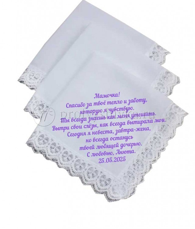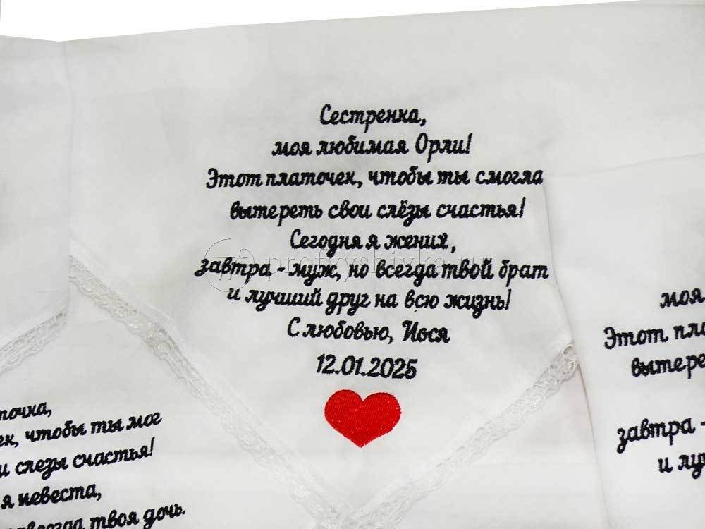 Создайте трогательные и незабываемые сувениры для своих близких с помощью нашей вышивки на свадебных платочках. Мы предлагаем вышивку имен, дат, инициалов и особых посланий на платочках для мамы, папы, бабушки и дедушки. Эти платочки станут символом любви и благодарности, которые останутся в памяти на долгие годы.